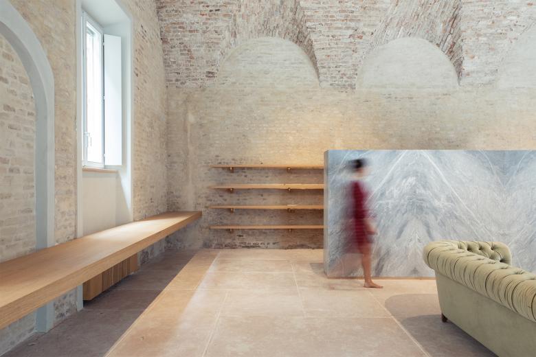 The two volumes were originally intended for a small theater room and a residential building respectively. Our project, keeps the distribution scheme of the plant unchanged and works on the redefinition of the individual internal and external spaces, through the introduction of architectural elements, furnishings and the search for finishes capable of expressing an idea of spirituality