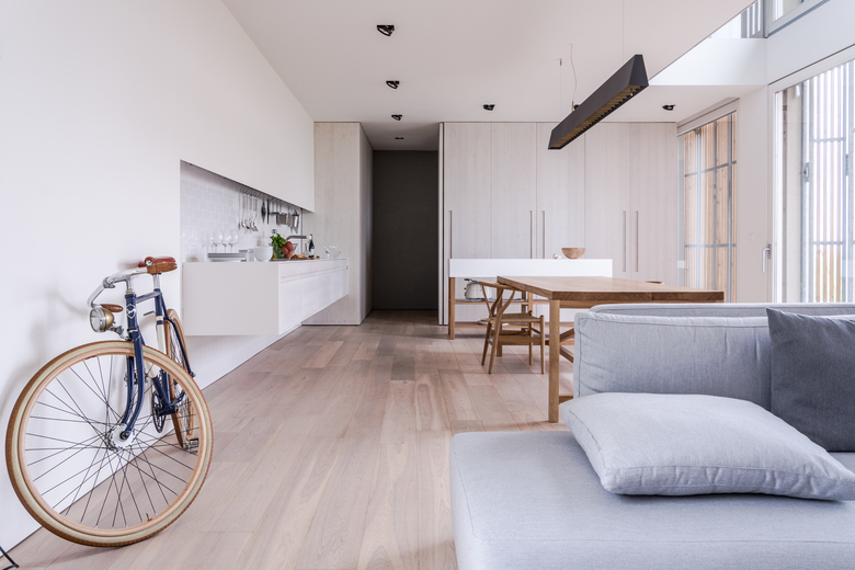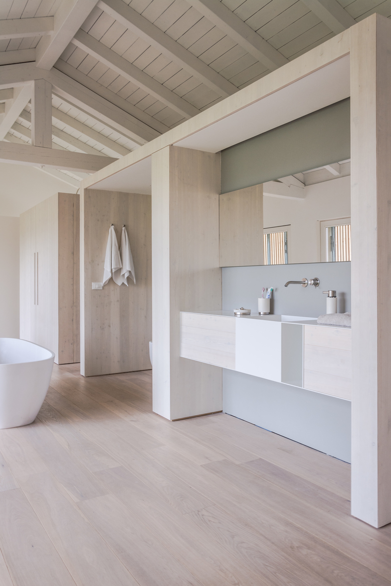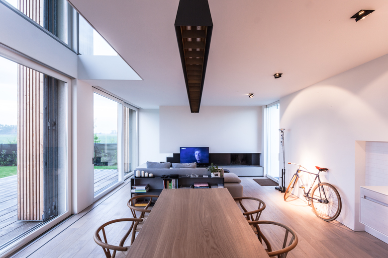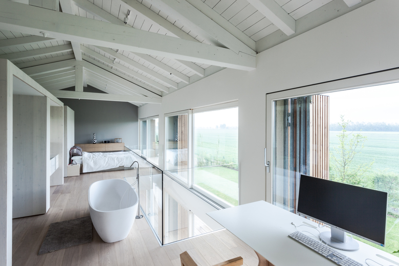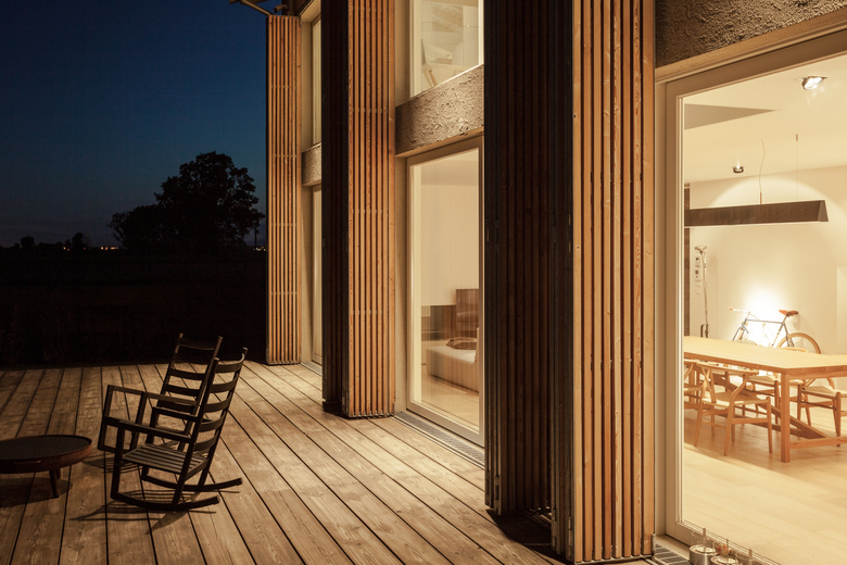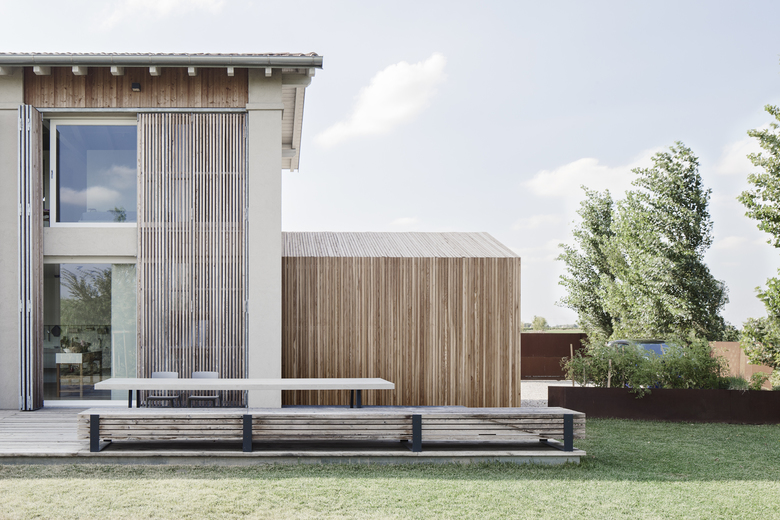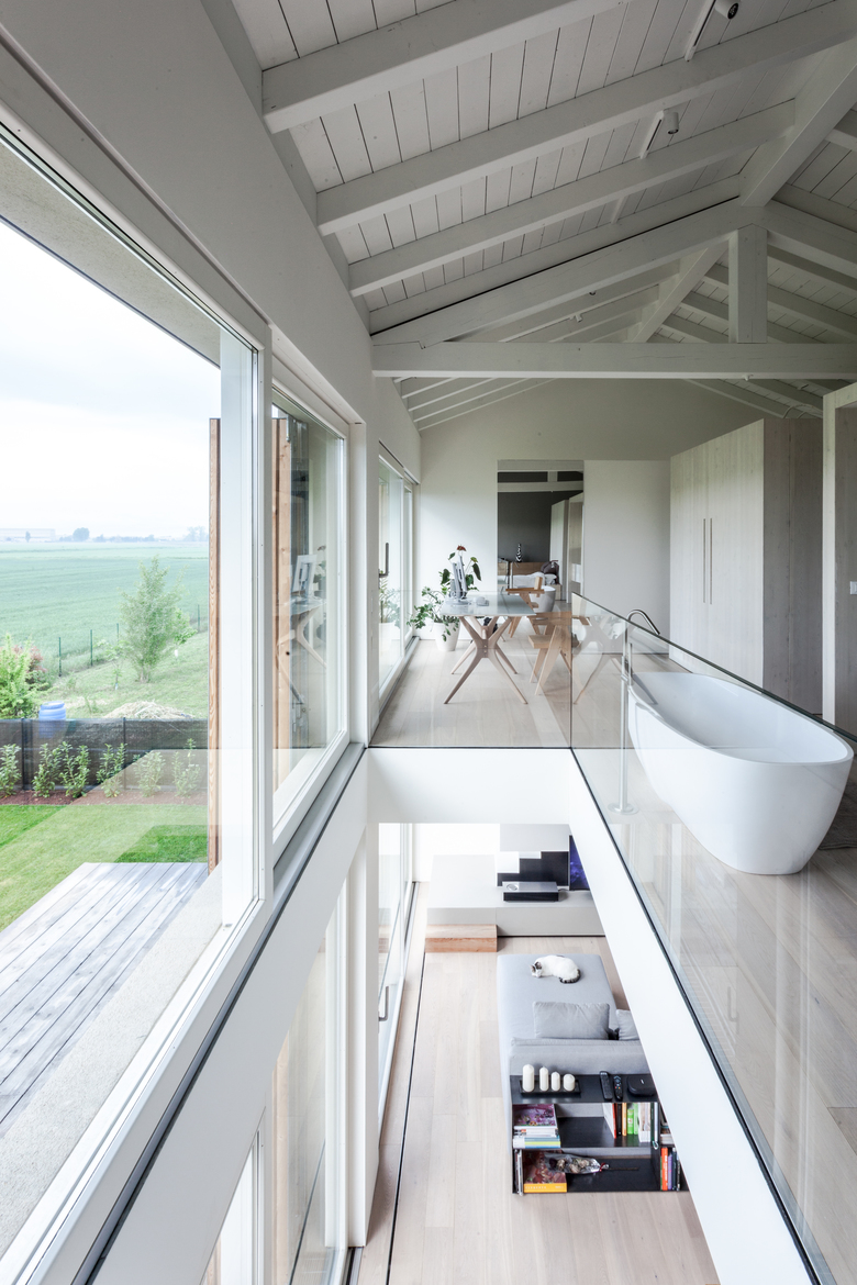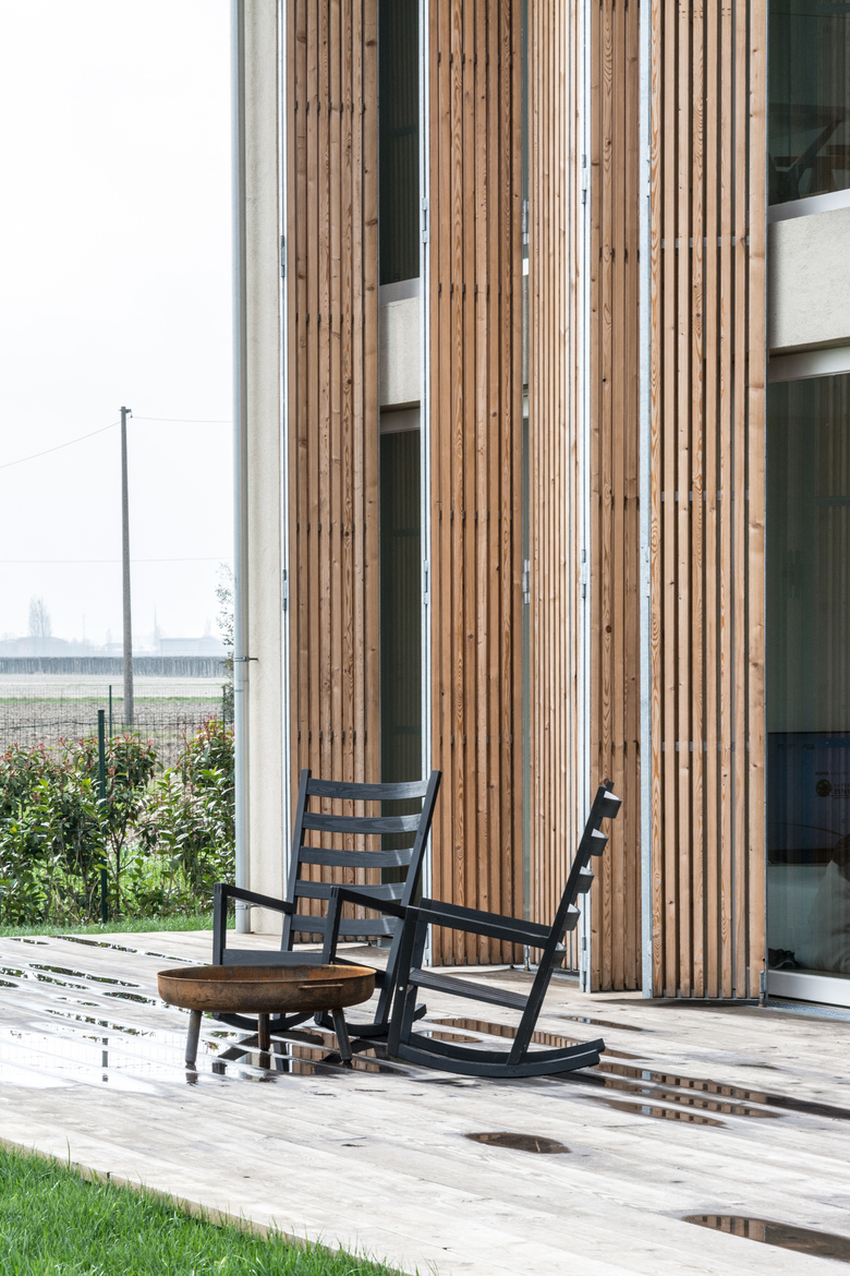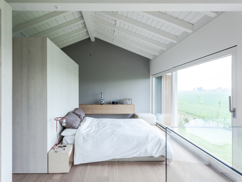 The main facade is almost no openings except the front door and two small windows on the first floor, while the rear façade that overlooks the countryside opens fully to the outside and the plain landscape is the background to the internal space