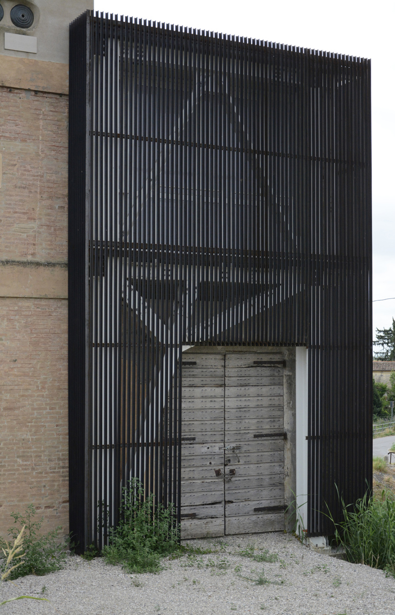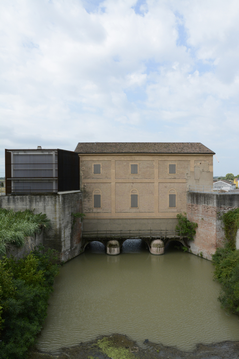 The covering in corten was the last phase of the renovation of “Chiavicone Bondanello”, started in 2009. The building, with hydraulic function on “Cavo Fiuma”, was constructed in the XVIIth century and the actual aspect derives from a renovation in 1900. Furthermore in 1960 the building partially collapsed after the river overflow and it was reconstructed.
