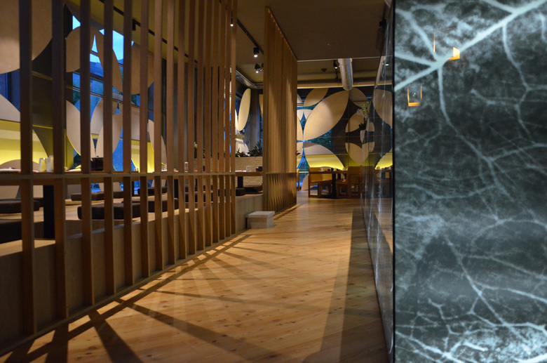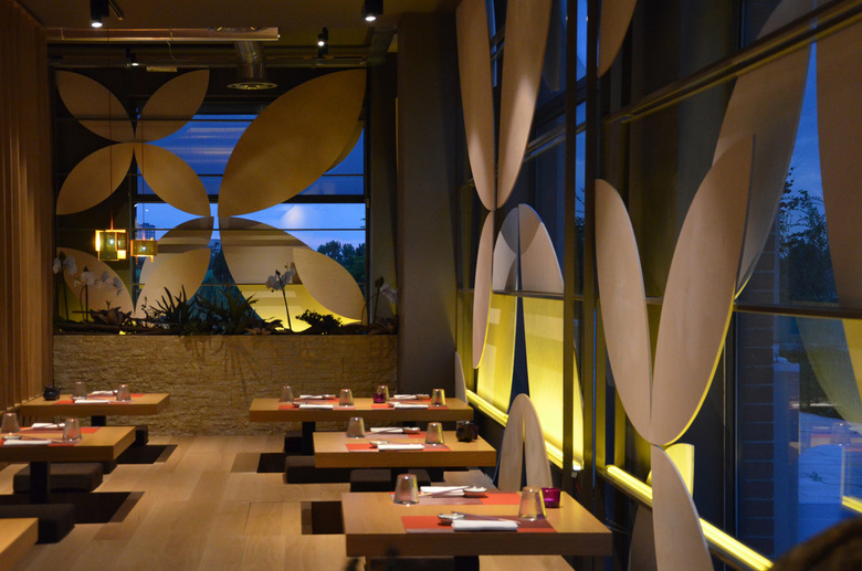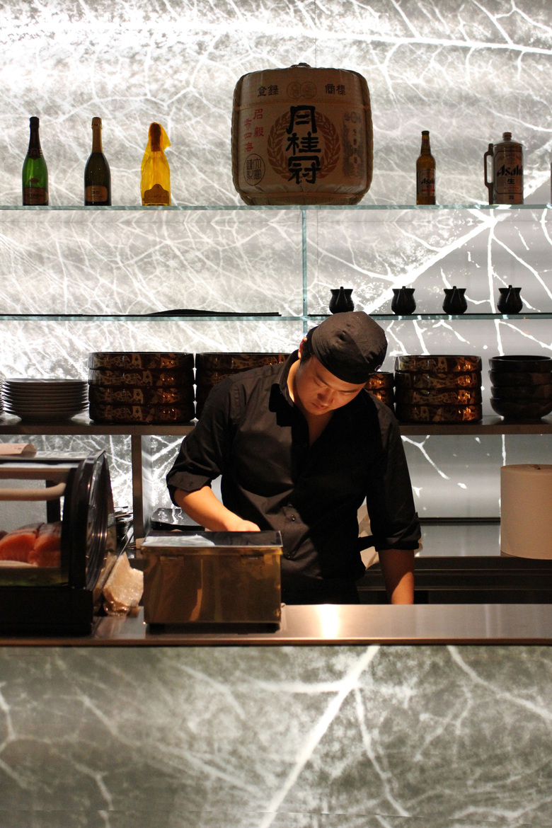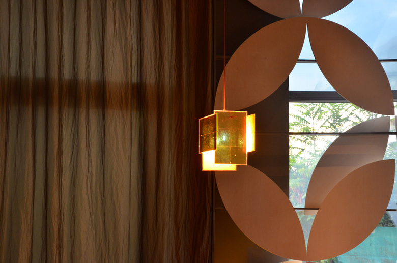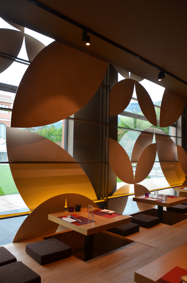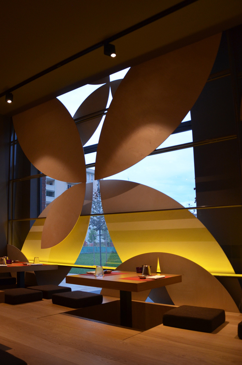The images of the leaf of the tea, the smoke of incense and lotus flower, are decontextualized, scaled and abstracted become structural elements of the scenery.