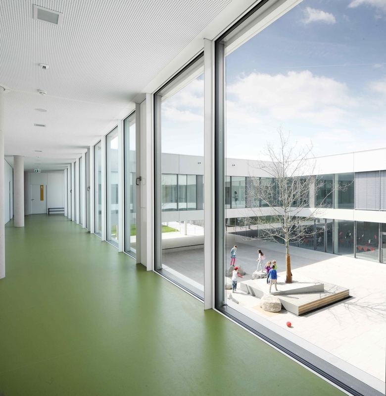 Reserveflächen für den Ausbau der Schule zur 4-zügigkeit werden bereits vorgesehen. Alle Klassenräume werden umlaufend in einem quadratischen Ringbaukörper im 1.OG situiert. Zwischen 2 Klassenräumen befindet sich jeweils ein Differenzierungsraum mit Verbindungstüren zu den Klassenräumen.