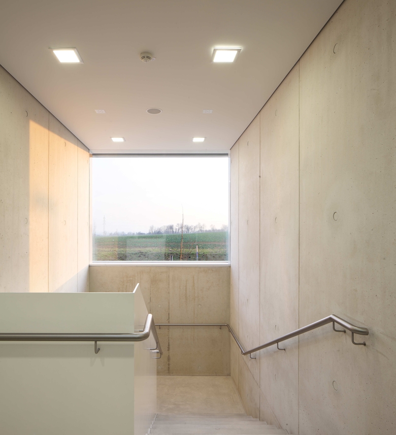Im Untergeschoss werden die Fachunterrichtsräume, die Hausmeisterwohnung und Technik- und Lagerräume untergebracht. Die offene Pausenhalle verbindet über Freitreppen und über einen behindertengerechten Aufzug alle 3 Geschosse.