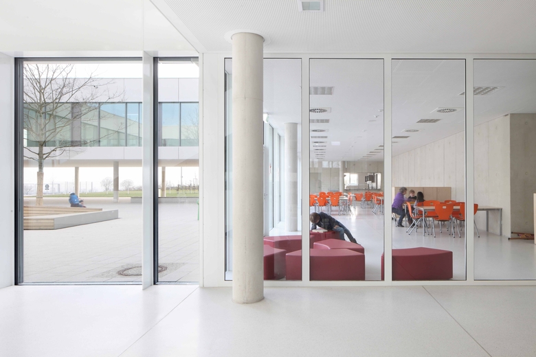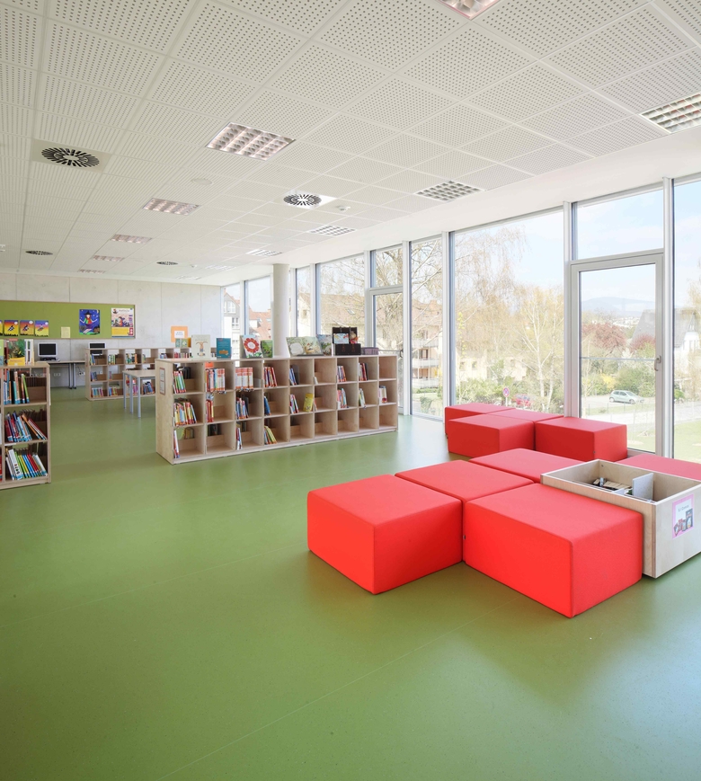Die Räume für die Betreuung befinden sich als eigenständiger Raumverbund im Erdgeschoss am Anschluß zur Pausenhalle und den Räumen der Verwaltung. Hier sind 2 Aufenthaltsräume und 1 Ruheraum für die Schüler, ein offener Mensabereich mit Küche und Räume für das Personal geplant. Die Küche ist als reine Aufwärmküche (Cook und Chill-Prinzip) ausgerichtet. ein 212 m² großer Raum am Eingang der Schule dient als Schulbücherei und Mehrzweckraum.