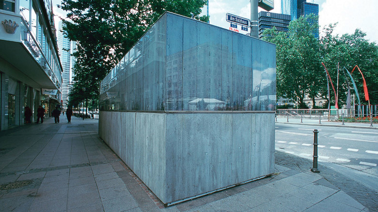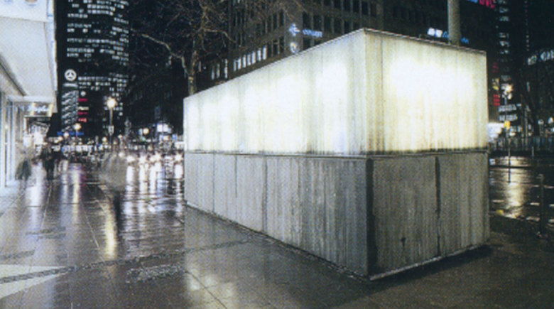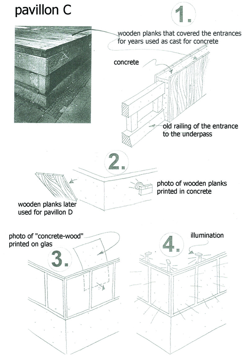Mit ihren Sockeln und den Glasaufsätzen zitieren die Pavillons die Vitrinen und beleuchteten Schaufenster, die diesen städtischen Bereich prägen. Hier werden jedoch nicht Produkte des Marktes gezeigt. Vielmehr stellen hier die Pavillons das Material vor, daß über ein Jahrzehnt die ehemaligen Abgänge zur verwahrlosten Fußgängerunterführung verschlossen hat: Holzbretter. Diese "Orginal"-Holzbretter wurden als Abdruck in Beton gegossen und darüber als "leuchtender Beton" auf Glas gedruckt. Der Sockel des gegenüber liegenden Pavillons wird direkt mit den Original"-Gerüstbrettern verkleidet und als Holzabbild per Siebdruck auf das hinterleuchtete Glas gedruckt: "Leuchtendes Holz". Diese oberirdischen Zwillingspavillons werden durch die Straße "Am Salzhaus" getrennt.