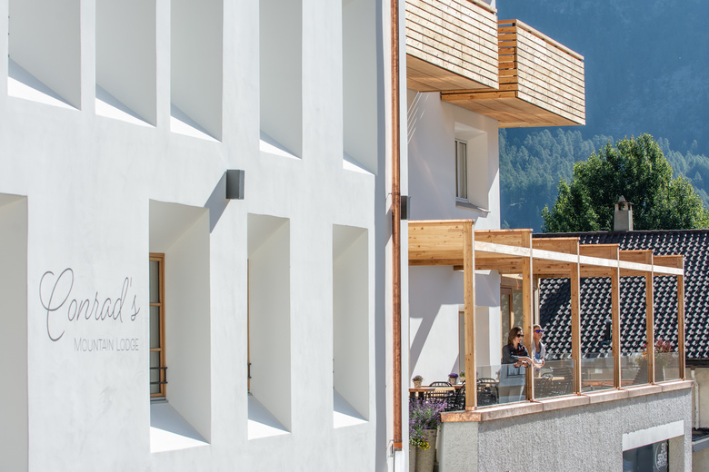 Umbau, Erweiterung und Aufstockung des Hotel Conrad in Silvaplana unter größtmöglicher Berücksichtigung der Wirtschaftlichkeit und somit der Beibehaltung der erhaltungswürdigen Bauteile. Das Projekt belässt den Altbau im UG und im EG in seiner Grundsubstanz und erweitert ihn um ein Stockwerk nach oben (3.OG).