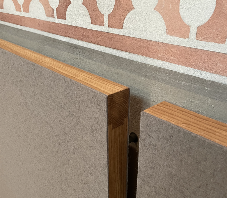 Es war uns als Architekten und Gestalter sehr wichtig, für die eingesetzten Materialien Naturprodukte zu verwenden. Rahmen aus massivem Eichenholz wurden mit schwerer Mineralwolle gefüllt, mit einer Lochplatte und mit einer Filzplatte abgedeckt. Dieser Filz auf Absorber, Bänken und Stühlen wurde zu 100% aus Schafwolle hergestellt und strahlt durch die zurückhaltende Farbgebung