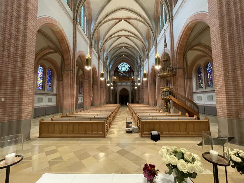 Nun galt es den Schall der neuen Lautsprecher genau auf Zuhörende und somit genau auf die die neuen Absorber in Bänken und Stühlen auszurichten. Wir haben jetzt 11 Lautsprecher. Die wichtigsten davon sind die beiden Hauptlautsprecher beidseitig des Volksaltares. Sie richten den Schall mit neuester Elektronik präzise auf die Kirchenbänke des Langschiffes. Durch Richtungssteuerung kommt der Schall jetzt aus der Richtung des Sprechers, auch in den hintersten Bankreihen hört man jetzt den Schall aus Richtung der Sprechstelle und nicht wie vorher, aus der Richtung des Lautsprechers.