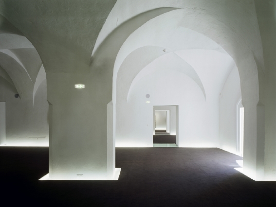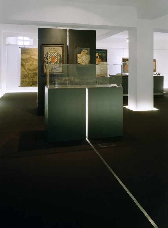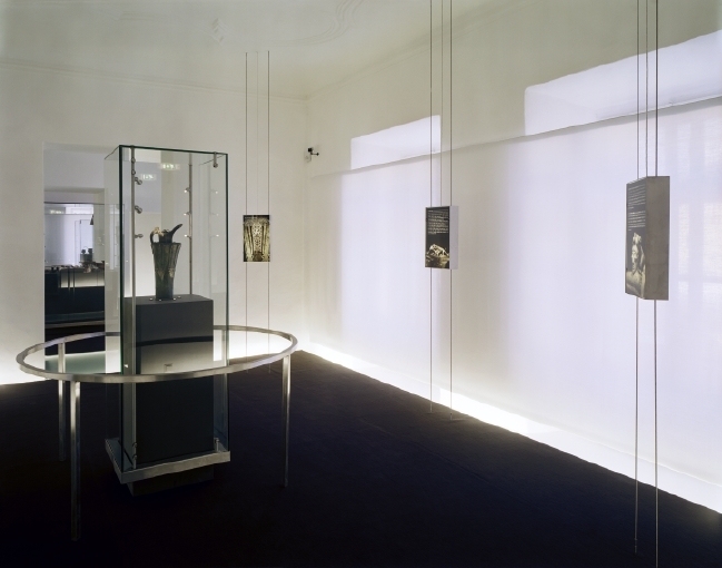 Die Ausstellungsflächen über 3 Geschoße werden mit einem neuen anthrazitfarbenen Teppichboden markiert, der als Doppelboden auch als Verteilerebene für die einzubauende Haustechnik dient.