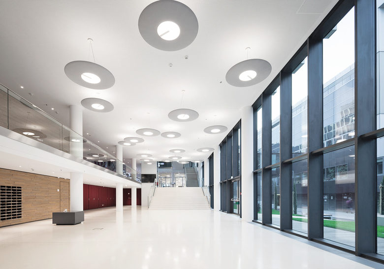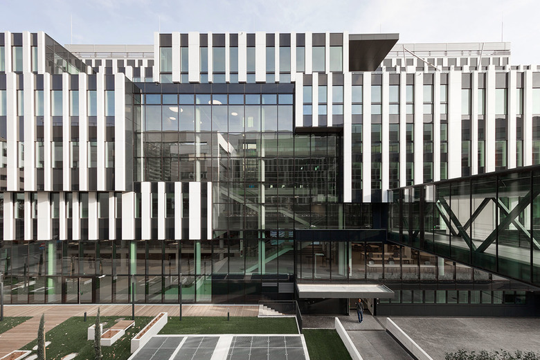 Die vertikal gegliederte Fassade des Neubaus verweist – als Anspielung auf einen „DNA-Fingerabdruck“ – bereits von außen auf die Forschungstätigkeit im Inneren.