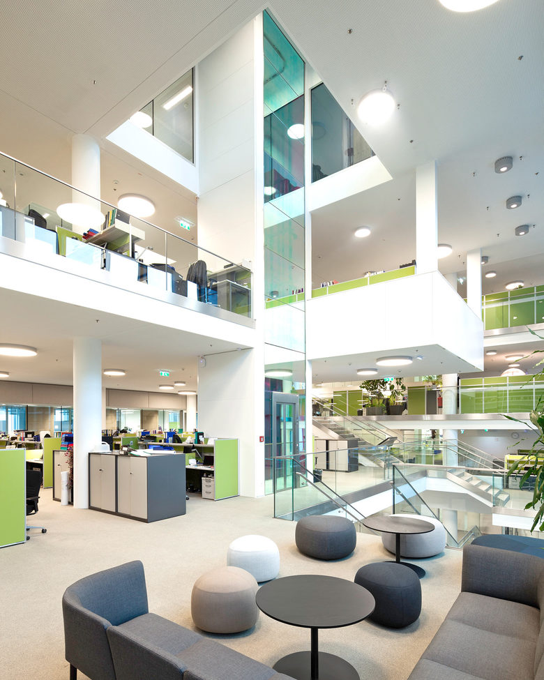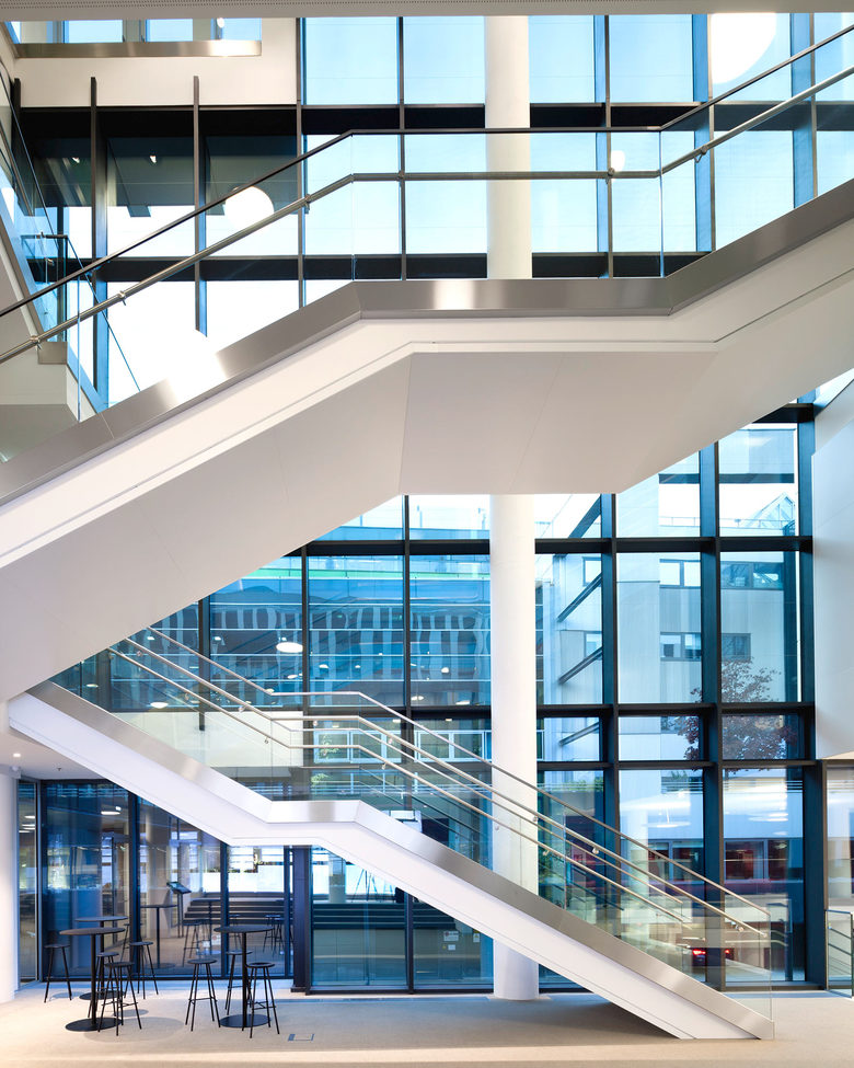 Im neuen IMP-Gebäude dreht sich nun alles um Forschung und Interaktion. Herzstück ist ein großzügiges, fünfgeschossiges Atrium, um das sich offene Arbeitsbereiche, gemütliche Meeting Points und die Laborzonen anordnen. Über eine gläserne Brücke ist das IMP mit den gegenüberliegenden Nachbarsinstituten, IMBA und GMI, verbunden und fördert den interdisziplinären Austausch zwischen den Wissenschafter_innen.