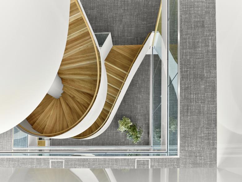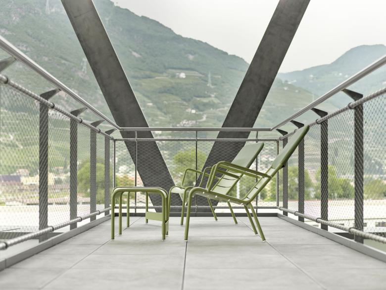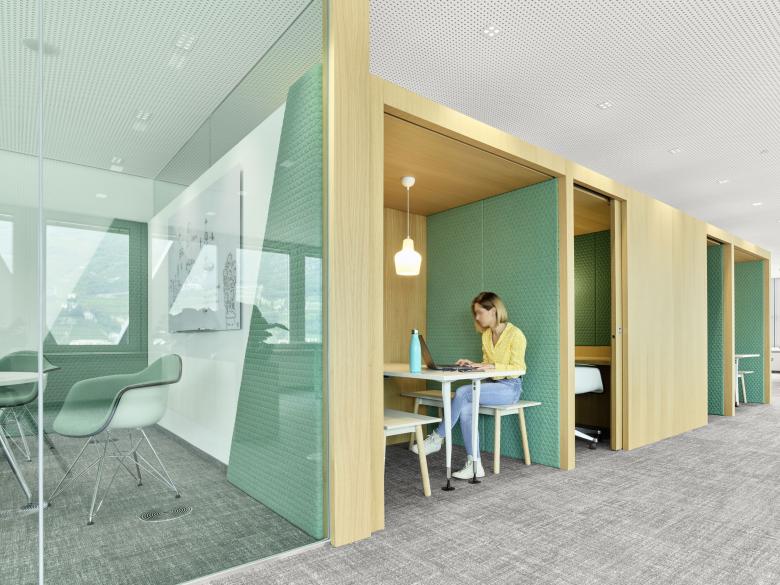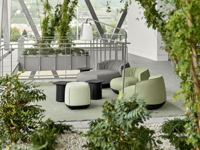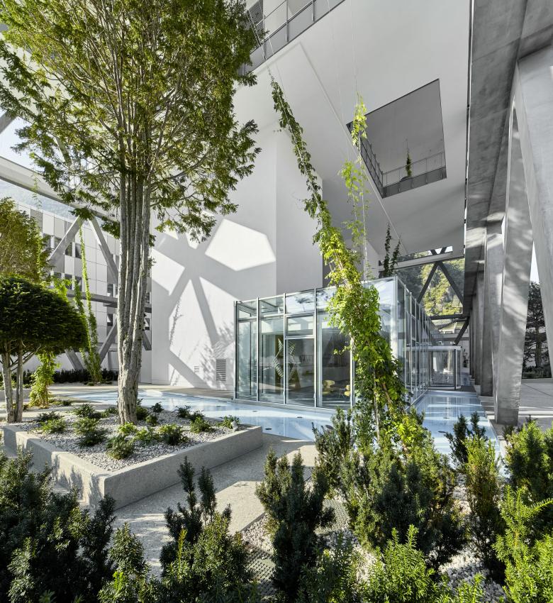 Das energieeffizient gebaute Bürogebäude ist über einen großzügigen Vorplatz öffentlich zugänglich. Über einigen „Luftgeschossen“ schwebt in 14 Metern Höhe eine „Gartenetage” für Pausen und Veranstaltungen, die per Wendeltreppe mit der abermals darüberliegenden Kantine verbunden ist. Sie gibt den Auftakt nach oben zum eigentlichen Bürobaukörper. Bei milden Südtiroler Temperaturen lässt es sich solcherart auch im Grünen arbeiten.