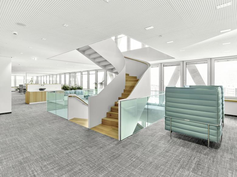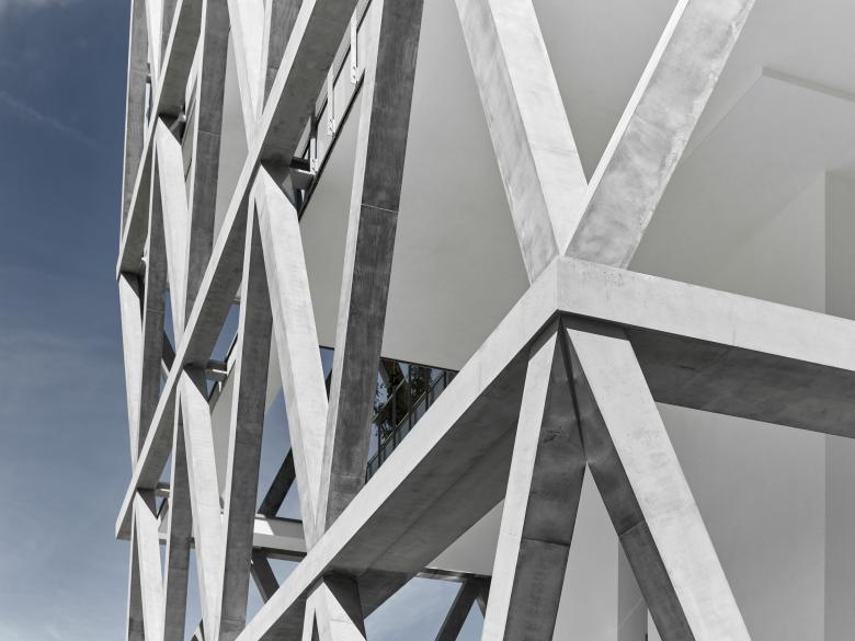 Voraussetzung für das stützenfreie und damit äußerst flexible Open-Office-Konzept ist die V-förmige, massive Fassadenstruktur, die in Kombination mit den zentralen technischen Erschließungstürmen das Tragwerk bildet. Der Hybrid aus Stahlbeton und eingegossener Stahlkonstruktion trägt an den Knotenpunkten das gesamte Gebäude. Mit diesem speziellen Fassadenkonzept verfügen die Büros über große innenarchitektonische Flexibilität und einer Tageslichtausleuchtung mit einem Faktor von über 2. Aufgrund der ausgenutzten Höhe bietet sich von den Arbeitsplätzen ein Panoramarundumblick über die umgebenden Bauten hinweg auf die malerische Bozner Kulisse.