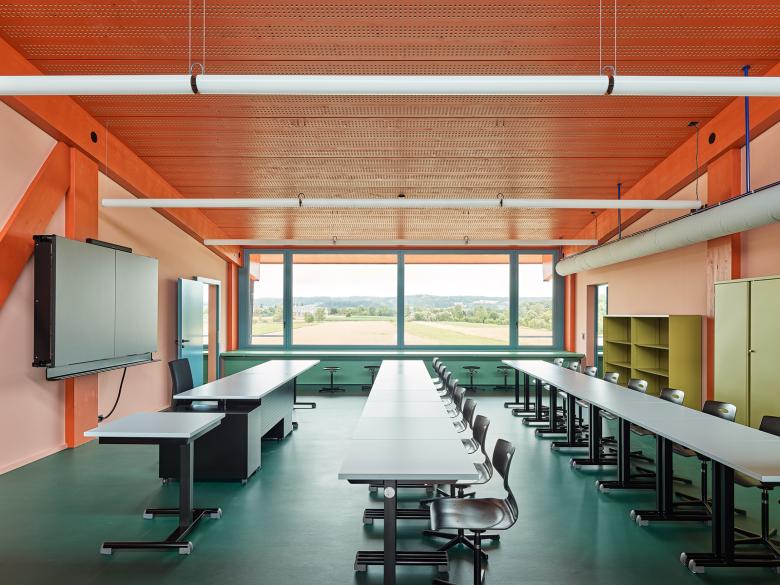 Zur einfachen Fügung des Holzbaus kommen sämtliche weiteren Elemente additiv hinzu und bleiben über ihre Farbe eigenständig. Im Haus ist alles bunt: es gibt keine Materialfarbe und auch kein Weiss. Der Innenraum entsteht über das Zusammenwirken der einzelnen Farben. Die Polychromie nimmt das Leben des Schulalltags vorweg.