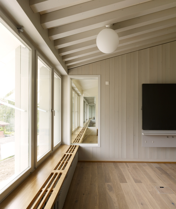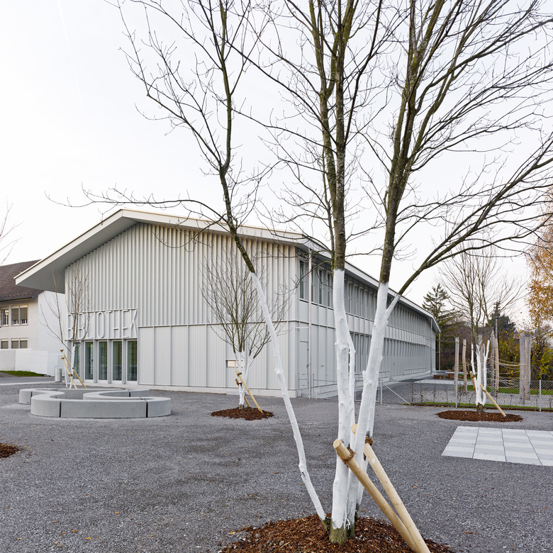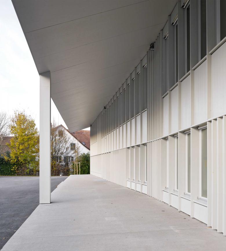 Die Grösse des Neubaus lässt ihn massstäblich für den Ort und für seine Nutzer erscheinen. Die Verwendung des ortsüblichen Baustoffs Holz bindet das Haus darüber hinaus in seine Umgebung ein. Die mit vertikalen Holzlamellen verkleidete Fassade ermöglicht durch ihr Spiel mit offenen und geschlossenen Elementen Durch- und Einblicke: Das Haus wirkt leicht und transparent. Ein lichtgrauer, seidenglänzender Anstrich verleiht dem Holzbau Abstraktion und fügt ihn optisch mit den beiden vorhandenen Schulbauten zu einer Einheit zusammen.