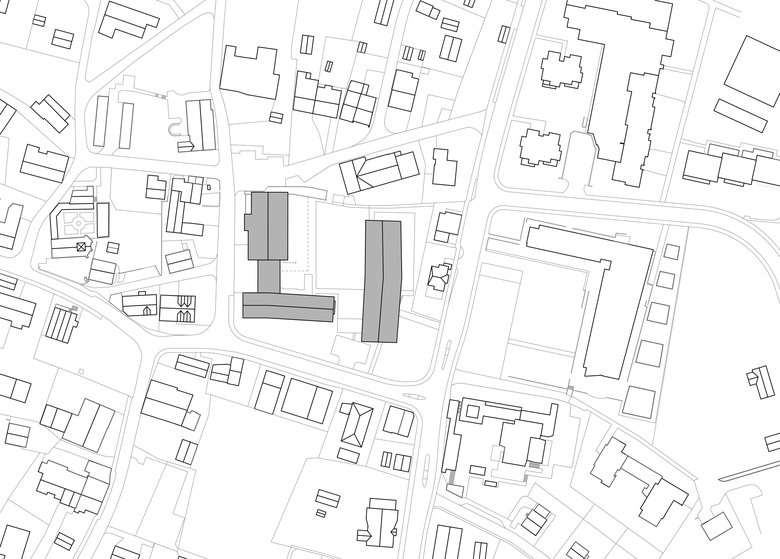 Das Schulhausareal Dorf befindet sich am Rand des alten Dorfkerns von Dietlikon. Der zweigeschossige Neubau beherbergt sechs Grundstufenzimmer und die neue Gemeindebibliothek. Mit den beiden bestehenden Schulhäusern fasst er einen Hof, der als Pausenplatz dient.