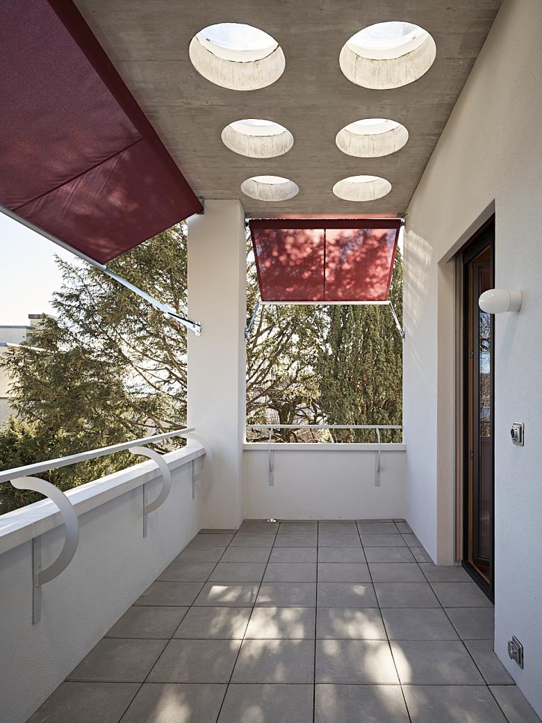 Das Wohnhaus an der Alten Landstrasse in Rüschlikon ist ein Doppelhaus mit zwei sehr unterschiedlichen Hälften, die je über eigene Qualitäten verfügen. Das rechte Haus ist kompakt und hat seine Wohnräume im Erd- und Dachgeschoss. Die Ausrichtung zum See und die Berge erfolgt über die Südseite und das Zimmer auf dem Dach genießt Abendsonne von Westen. Das linke Haus ist maximal weitläufig. Das Wohnen befindet sich auf Gartenniveau, von wo aus allseitig Zutritt in den Garten besteht. Nach Osten eröffnet sich die Sicht auf den See. Die Schlafräume liegen im Dachgeschoss und sind zum See sowie nach Westen ausgerichtet. Verbunden werden die weit auseinander liegenden Räume über ein ovales Treppenhaus und einen Lift. Alle Zimmer im Dachgeschoss haben Zugang zu einer Dachterrasse mit Fernsicht. Beiden Häusern gemeinsam ist eine Wohnhalle mit großen Fenstern und einer Raumhöhe von 3.25 Metern.