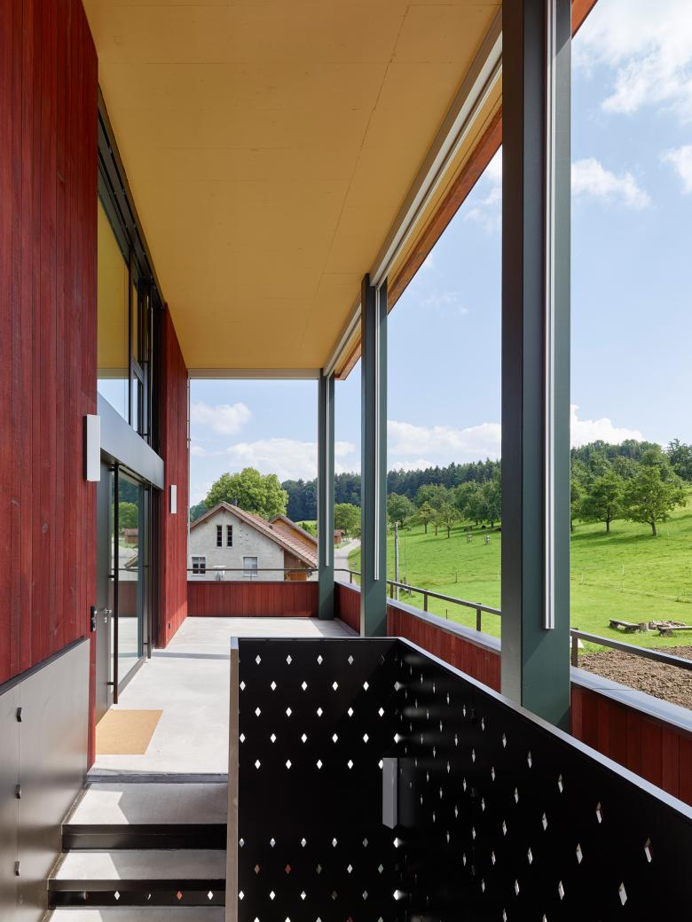 Der Ausdruck des Hauses ist durch seine äussere Tragstruktur aus grün lasierten Betonstützen und eine Hülle aus auberginefarbenen sägerohen Brettern geprägt. Zusammen mit den aussen dunklen Holzmetallfenstern, welche die Raumtiefe der Lauben betonen, wird eine Homogenisierung der Materialien erreicht, die eine ruhige Eleganz ausstrahlt. Mit dem matten Rot des Holzkleids werden Erinnerungen an die Farbe der ehemaligen Scheune geweckt, mit seinen Grüntönen fügt sich das Haus in den Kontext der angrenzenden Obstwiesen ein.