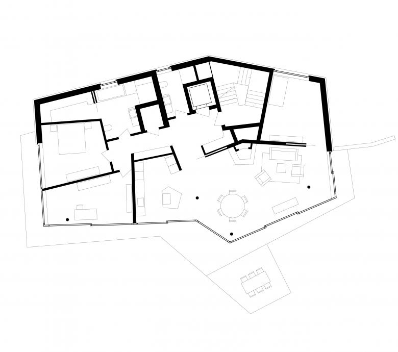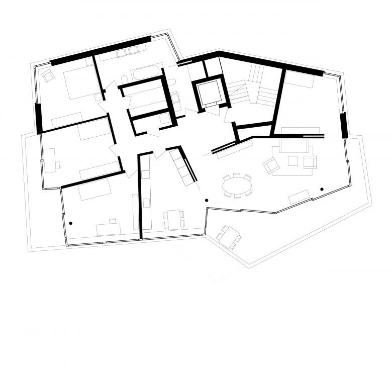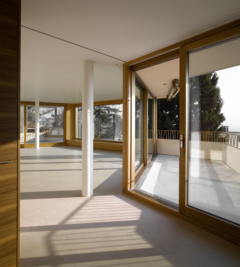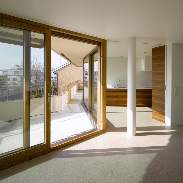 In allen Wohnungen ist ein Grundrisstypus mit klarer Trennung von öffentlichen und privaten Bereichen verschieden ausformuliert. Entsprechend den unterschiedlichen Raumgeometrien, der Aussicht und der Lage der privaten Aussenräume sowie dem Bezug zum Garten wurden differenzierte Grundrisse mit individuellen Qualitäten entwickelt. Thematisch knüpft der Wohnungsbau mit seinen genau determinierten Räumen und Bewegungsfiguren an den Reichtum bürgerlicher Wohnkultur der Nachkriegsmoderne an.