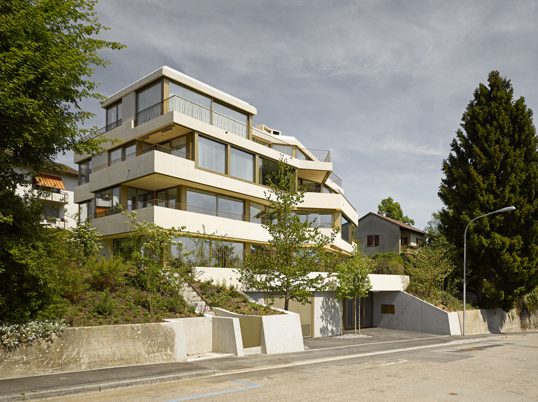 Das Grundstück befindet sich an privilegierter Lage am Hönggerberg mit Blick über die Stadt und die Berge. Anstelle eines Einfamilienhauses sollte dort ein repräsentatives Haus mit vier Eigentumswohnungen entstehen. Der Neubau fügt sich präzise in die Topografie ein und nimmt durch das Knicken des Volumens die Massstäblichkeit des Orts auf. Trotz höherer Dichte gelingt die Neuinterpretation des Themas eines Wohnhauses im Privatgarten: Die Wohnungen verbinden die Ideale des Einfamilienhauses – Privatheit und Gartenbezug – mit denjenigen einer städtischen Geschosswohnung.