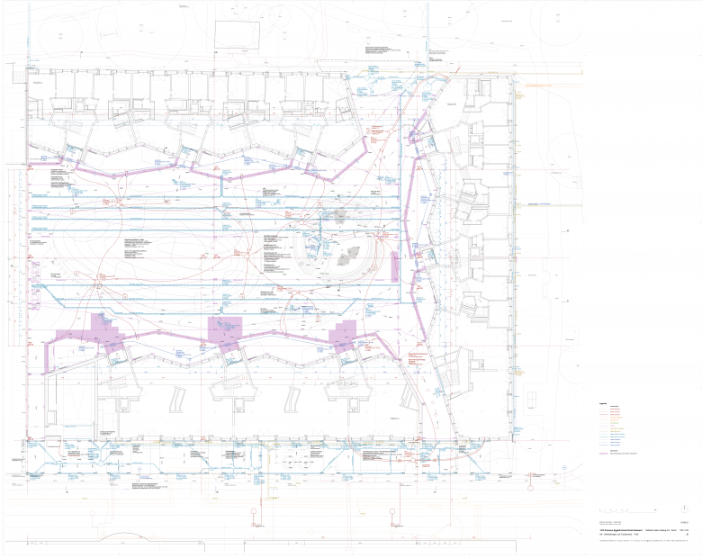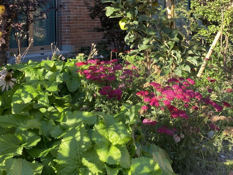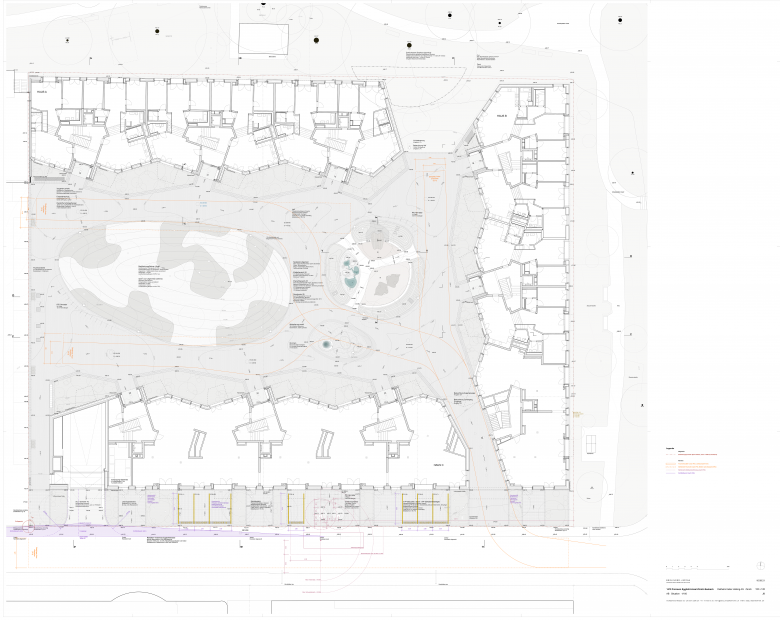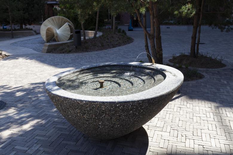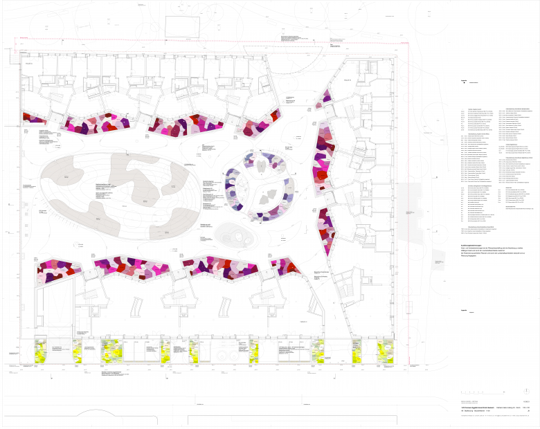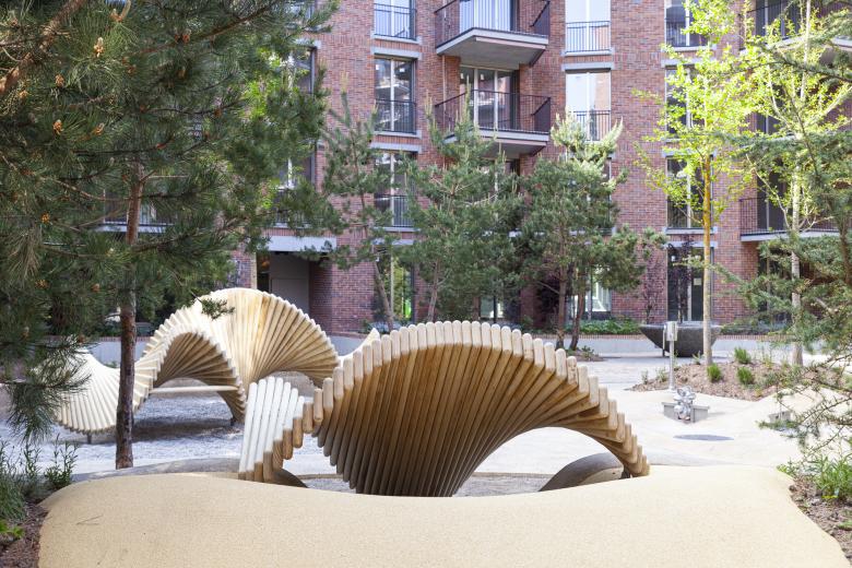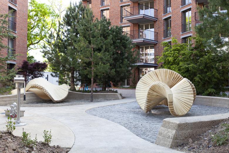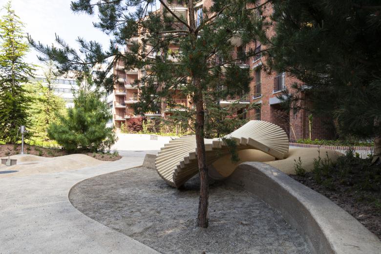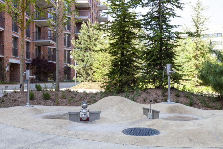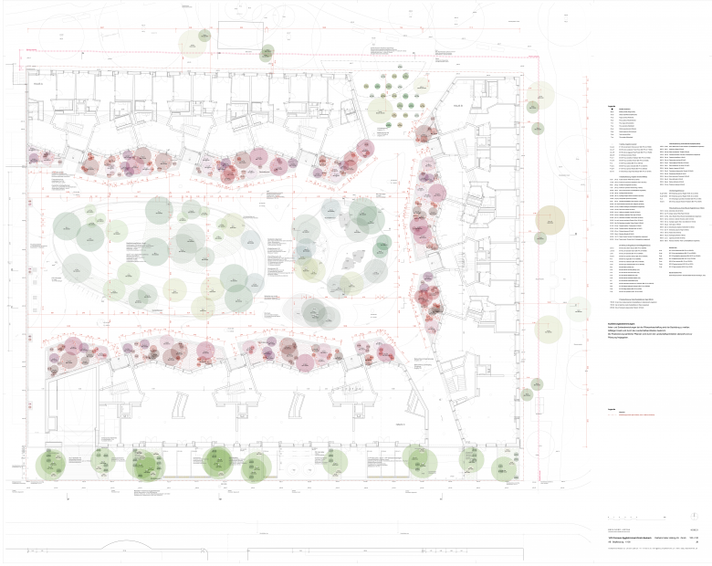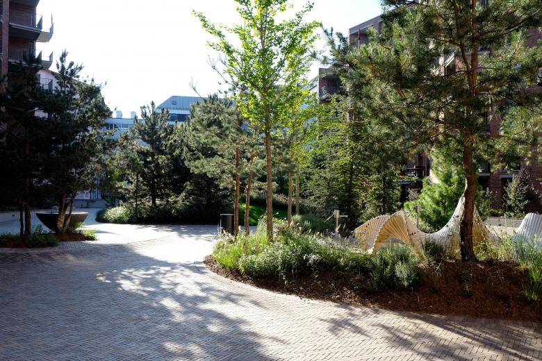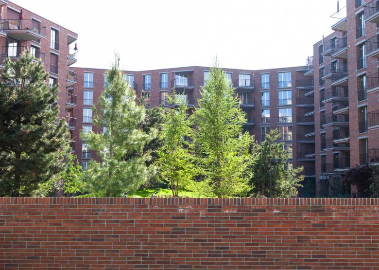 Der Innenhof der Wohnsiedlung ist als eigenständige Gartenwelt konzipiert, die auf andere, angrenzende Freiraumtypologien reagiert. Das Gesicht dieser inneren Gartenwelt besteht aus einer bewegten Topografie, die eine räumliche Basis bereitstellt und gleichzeitig die vielfältigen technischen Anforderungen erfüllt. Es sind Themen wie eine ausreichende Erdüberdeckungen auf der Einstellhalle (nachhaltige Grünentwicklung) und eine gut funktionierende Oberflächenmodellierung (Oberflächenentwässerung), die eine nachhaltige Entwicklung der Grünanlage garantieren. Durch sein hohes Mass an sicker- und verdunstungsfähigen Flächen und einen hohen Grünanteil wird ein kühlendes Mikroklima mit grosser Aufenthaltsqualität geschaffen.