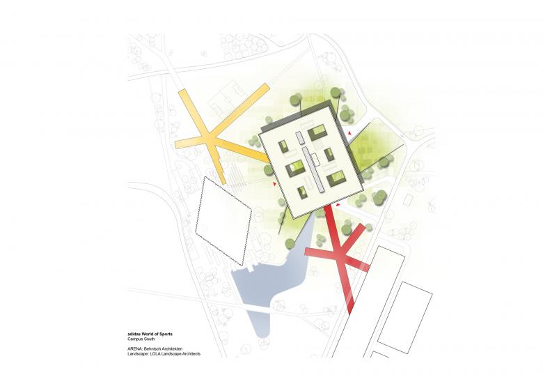 The ARENA is an integral part of the Campus World of Sports, which has recently been expanded. The landscape design was undertaken by the Dutch firm LOLA landscape architects, who were responsible for the “stars”—the colorful connecting paths laid out in the shape of an asterisk—and for the campus areas.