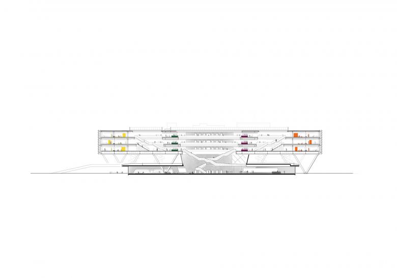 The architectural idea behind the ARENA building is predicated on a finely balanced interplay between transparency, landscape, and a modern concept of work based on communication and interaction across professional fields as well as responsiveness to future developments. The result is a striking landmark formed by an abstract volume housing three workspace floors that hovers above a modeled landscape. This sculpted hill accommodates the building’s entrance area, part of which is publicly accessible, leading to a vast bright atrium suitable for a variety of events.