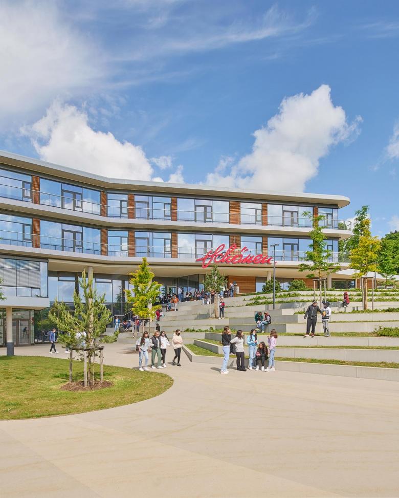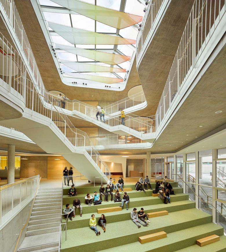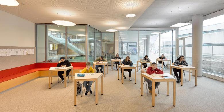 The main aim of the architectural concept was to create a space that would cater to potential developments in education in the coming years. It was important for the structure to be flexible enough to allow a curriculum to be delivered during a phase of didactic transition. The design is intended to promote a strong sense of identity, while integrating smoothly into the existing school campus. A schoolyard located in the center of the campus is shared with the adjacent grammar school, the Paul Klee Gymnasium. The spacious area offers the students of both schools room for lunchtime or afternoon activities. The site’s topography was used to maintain the north-south axis passing across the traffic-free school area and made it possible for this axis to be redesigned in a way that would be disability friendly.