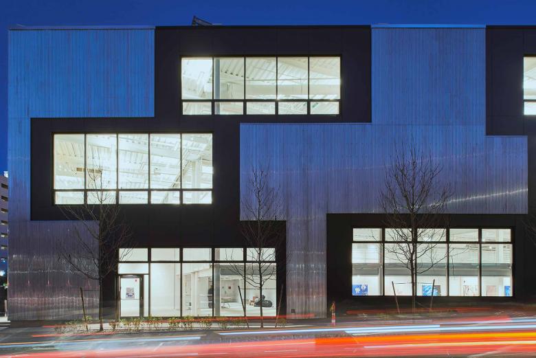 The straightforward building facade concentrates generous glazed openings at key areas in the floorplan in order to bring daylight in the gallery/event pre-function spaces and illuminate activities and art within from the street. These “shop windows” are expanded visually through the use of charcoal-colored metal panel surrounds, set into a field of stainless steel corrugated cladding that references the facade of the original EpiCenter as well as the industrial character of the historic South Boston waterfront.