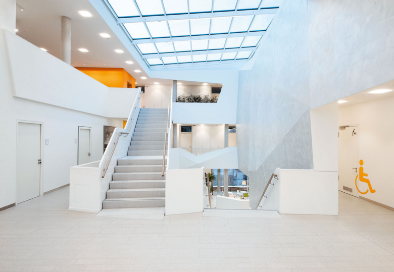 The new hall accommodates primarily public functions. It is designed as a multi-functional venue that houses a variety of programs – including space for citizens’ services, administrative offices, meeting rooms, as well as a public library and a registry for weddings - all under one roof. In addition, part of the project brief was to vitalize the ground floor level of the city center. This was accomplished through the integration of retail program at ground level, consisting of shops and a café. Their presence here has transformed this public space into an environment that is lively and engaging both during and after business hours. The entrance of the town hall from Marienplatz leads into an atrium that hovers above the stories. From here, visitors can circumnavigate the building and experience it as a truly public space - a flowing, communicative public thoroughfare for casual and planned encounters.