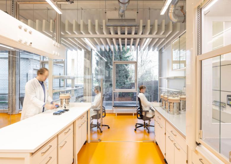The site to the north of Neuenheimer Feld adjoins the “technology park” on the DKFZ Campus. The building is extremely compact in design and consists of a laboratory and functional level on the first floor as well as three upper “storage levels.” These serve as a biobank and house the nitrogen-filled containers that are used to freeze the cells. The crucial technical services are located on the top floor. The eastern side of the building contains the access and supply core with technical, sanitary, and infrastructural services. This core connects the first-floor research area with the three storage levels above.