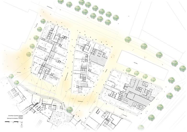 There have been some major changes to the scheme since Behnisch Architekten won the competition in spring 2010. The building of the former Hotel Silber has been preserved. Here the state of Baden-Württemberg committed itself to install a memorial, in memory of the building’s the former use as a Gestapo headquarter from 1937 to 1945. The preservation of this building, which was almost completely destroyed during World War II and subsequently rebuilt in a different appearance, has led to a complete restructuring of the original design. Now the buildings restrain themselves towards their surroundings in terms of height and size. At the same time they respond expressively in their architectural appearance to the urban characteristics of Stuttgart.