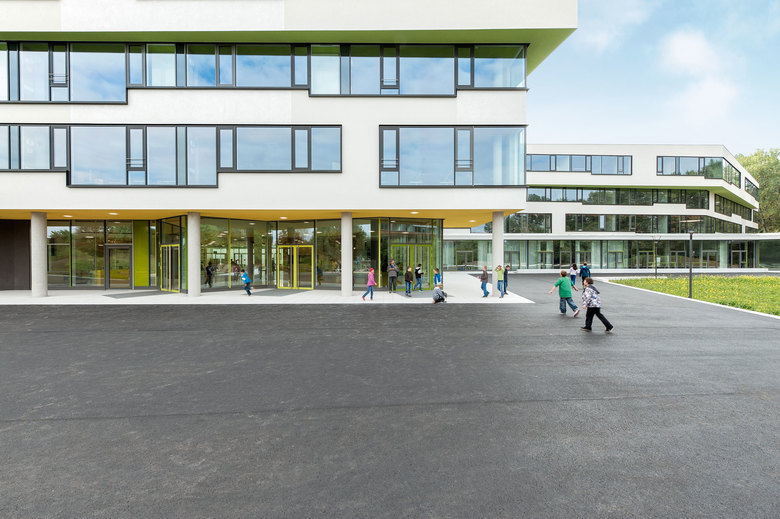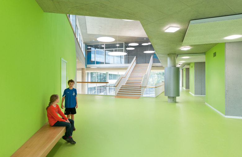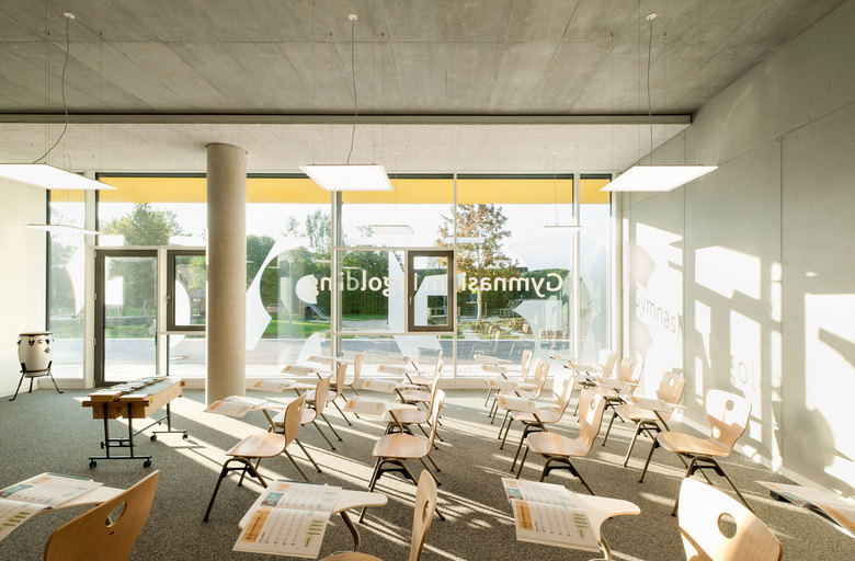 The new Ergolding Secondary School is a simple, technically optimized structure that establishes a warm, colorful and inviting interior for learning, one that reacts to and reinforces the qualities of the School's pedagogical vision.