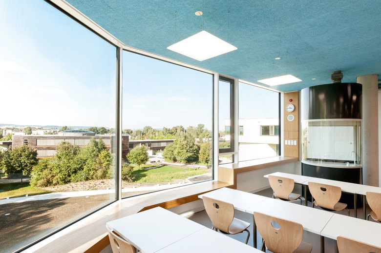 There is a Swedish proverb that says: "A child has three teachers: the teacher, the other children, and the (class)room." The alignment of the various areas of the full-time school is informed entirely by the holistic pedagogic concept behind the Ergolding Secondary School. On the ground floor, the daycare links to the exterior through the schoolyard, and to the interior, to the music room, the arts room, and the computer labs. The third floor houses the natural sciences: Physics, Chemistry, and Biology. Following advice from educational consultants, the teachers’ prep space and workrooms have been placed between the individual lecture rooms and laboratories. For each of the three natural sciences, a flexible classroom has been planned that can be used both as large lecture space, or divided into smaller classrooms through a partition wall.