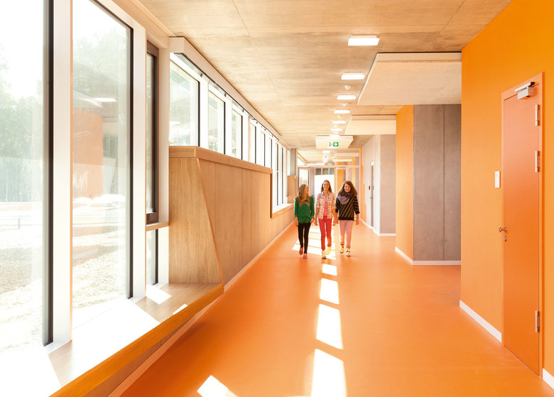 The hallways that lead from the classrooms and workshops gradually open up and broaden to become ‘extensions of the classrooms’ themselves with individual and group working spaces. These provide the students, teachers and parents with informal meeting points for gathering, planning extracurricular activities, and exchanging information. These ‘learning landscapes’ essentially strengthen the pedagogical work within the new building.