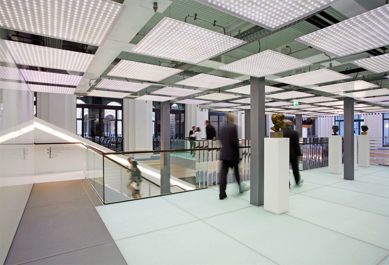 The light, free-floating character of the new extension is complemented and accentuated by a specifically developed LED lighting system.