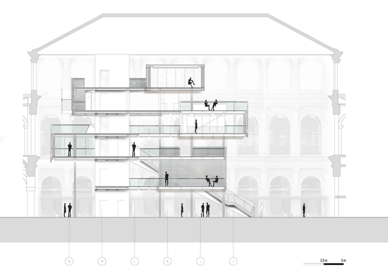 The new structure occupies a relatively small proportion of the hall in order to preserve its generous spatial character. A business start-up center, consultation, exhibition, club and meeting room facilities are arranged in a sculptural manner. The uppermost level affords access to generous roof terraces.