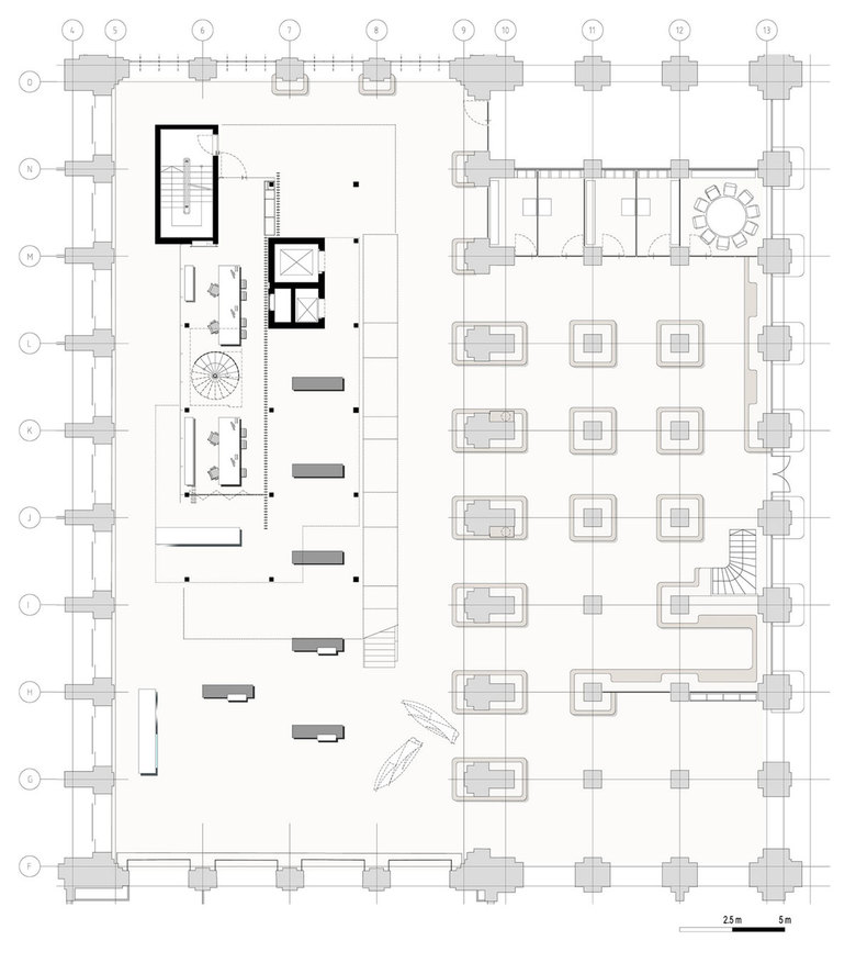 The structure is composed of layers and planes, where lightness, immateriality and reflection contrast the solid, elaborate walls of the existing building. It unfolds as seemingly free-floating levels and planes that consciously contrast the historic hall’s ponderous stone bulk: here, the soft lines of vaulted constructions, there, the clear lines of the new structure: a bright apparition constructed of luminous, transparent and reflective materials, reminiscent of a glittering, multi-faceted jewel that absorbs and refracts light.