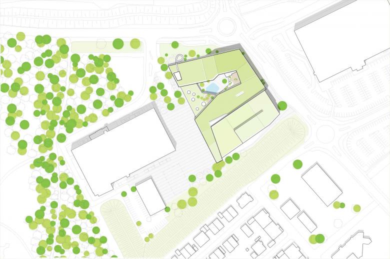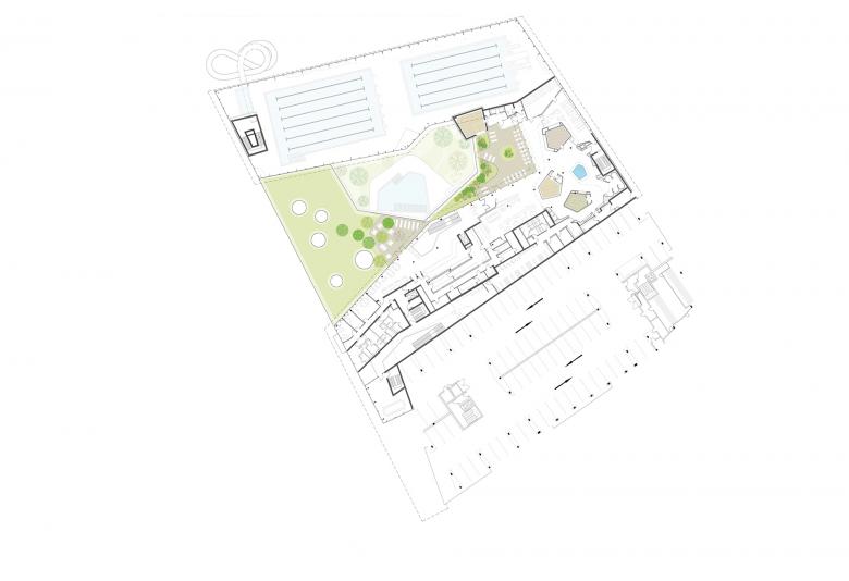 The ensemble of buildings has been constructed on the Sportpark site, which used to host the trade fair. Situated right next to the ZF-Arena, the complex houses Friedrichshafen’s new aquatic sports center as well as a parking garage. This new urban element is an exceptional addition to the structural landscape with its exciting, playful formal vocabulary, and provides an extra aquatic attraction for Friedrichshafen. The heart of the complex is the landscaped interior courtyard—an oasis of recuperation and relaxation that forms a central focal point in the building. This is the source of the center’s unique identity, where it develops its qualities from within.