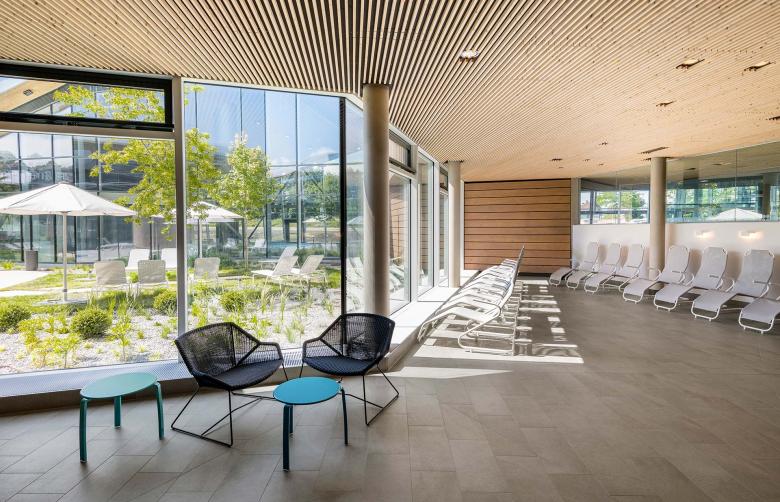 The swimming area has the open and transparent character of a bathing complex, suffused with light. The cool color scheme is pleasantly stimulating during athletic activities—a restrained backdrop that skillfully helps draw attention to the unique nature of the garden. The sauna world on the upper level successfully integrates various kinds of sauna, innovative shower experiences, a plunge pool, assorted quiet spaces featuring different moods, and a room with an open hearth—all adding up to the perfect conditions for hours of relaxation.