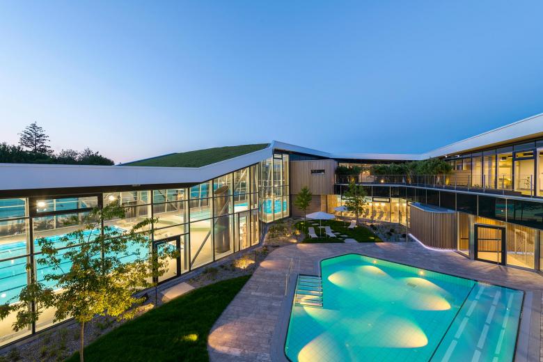 Behnisch Architekten has designed the new aquatic sports center Sportbad Friedrichshafen as a building that reveals its qualities from the inside out: this newbuild, with its differentiated roofscape, is arranged around a landscaped internal courtyard and resembles an island of relaxation and recuperation. A sport pool, sauna area and water features all contribute to a diverse amenity that appeals to adults, children, sport fans, and recreational users alike.