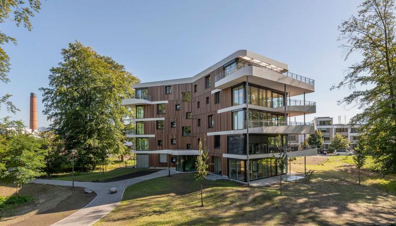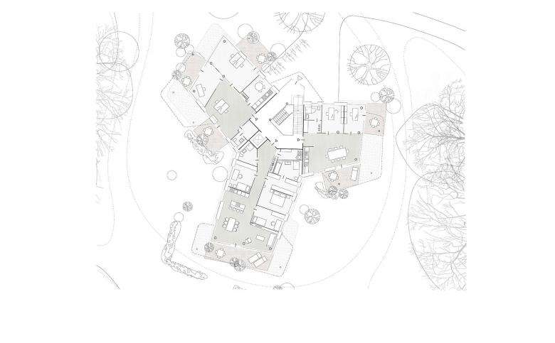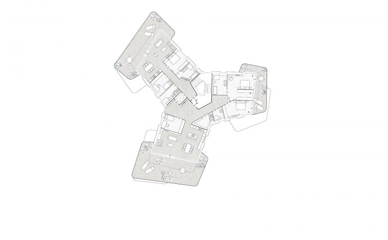 Designed as stand-alone buildings, the Y-houses take full advantage of their respective situation in the park. An important aspect when deciding on the location and orientation of each building was to protect as many of the existing trees in the park as possible; sight lines to the Alps, the park with its pond, the rope climbing net and Rose Garden were established. The five- to six-storied building volumes were developed from a solid core, which visually increasingly dissolve towards their far end and interlock with the surrounding landscape by virtue of randomly arranged balconies. Thanks to the Y-shape of the building foot print, every apartment benefits from natural light on three sides and its specific situation with respect to the surrounding trees, the sunlight exposure and views. As an extension of the floor space available for living, the balconies of each story project out differently from the building, fully respecting the specific floor plan of each apartment and as well as its exposure to sunlight.