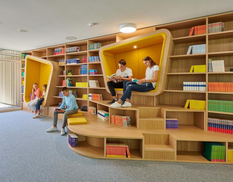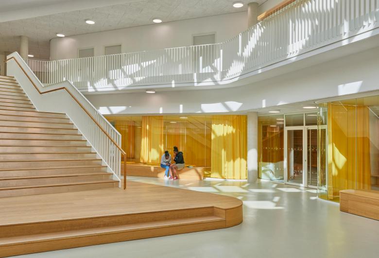 Inside, the look and feel of the new school is determined by a sense of lightness and openness. The overall mood is established by playful features, such as spaces inspired by the idea of a market square and other areas bustling with activity. Light floods into two atria, which provide vertical connections within the building.