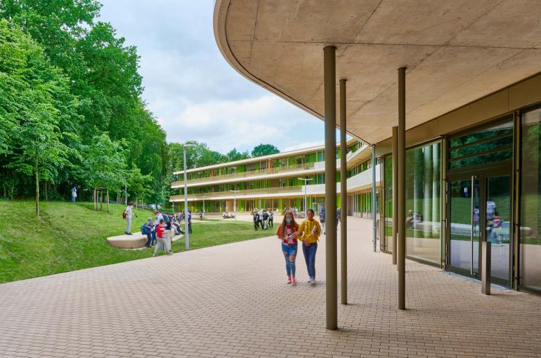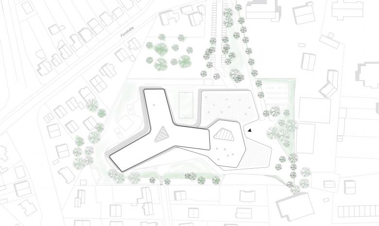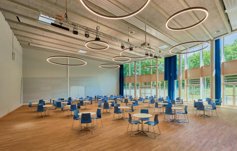 The school has a diverse spatial program, incorporating classrooms for general teaching and for specialized courses, common areas, staff rooms, and spaces to accommodate the administration and the functions required for day-to-day operations. The careful structuring of these spaces is offset by their varied arrangement in relation to one another. Two sports halls—one single-purpose and one dual-purpose—and a multifunctional room are available for physical education classes or club sports. Rounding out the spatial program are supplemental amenities in the form of a media library and a community school with a parents’ café and youth room: this means that the building is open outside school hours as a neighborhood resource for social interaction. Additional events and offerings are an inviting way of involving and nourishing the community. The school building thus forms a natural part of the local milieu, figuring as a vibrant meeting place and focal point open to neighborhood residents and thus makes an effective contribution to a vision of the future in which different generations interact and cooperate with one another.