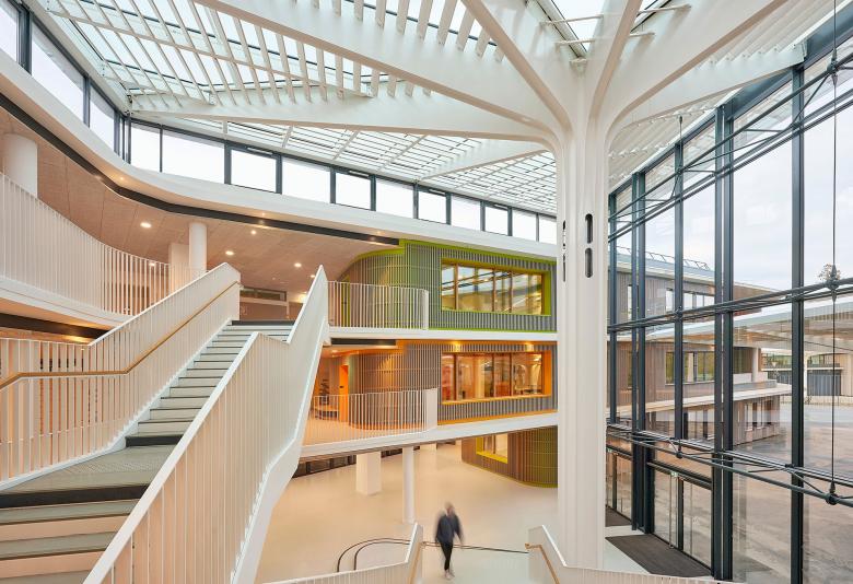 The look of the campus depends largely on the parasol structures, which from the park appear confidently in view, symbolically extending their protective roof over the school group. On the entrance side and on the street side, the lycée presents an orthogonal and rectilinear structure. The new parts of the building are adjacent to the existing building in the direction of the park and the school courtyard. Here, the school building is designed in a more free and open way. The curved wings of the building frame the school courtyard, from the middle of which the welcoming and protective parasols structures unfold. They create covered zones and mark the transition from the interior towards the exterior.