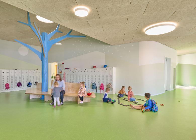 The way in which the individual groups are organized is also reflected in the external facade clad in wooden slats, with projecting and recessed sections creating different spatial environments. Large windows—some of which include inset seating niches—and ledges of a suitable height offer an inviting spot for the children to sit or play. The roof areas are extensively greened as a continuation of the overall nature-friendly concept.