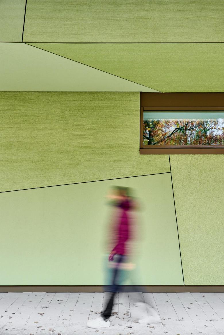 The learning house building sections are star-shaped and grouped around a central, spacious stairwell. The school building develops around this core. It forms the vertical and horizontal access- and orientation axis within the building, the place for encounter and communication with visual links to the sports hall, to the school canteen and to the outside spaces. From here, the music rooms and staff rooms, sports hall and administration tract can be accessed, as well as the dining hall and multi-purpose room, which are transparent from all sides and can be linked together. The house for children is partly inserted underneath the school building, while the other half is set like a pavilion in the green area.