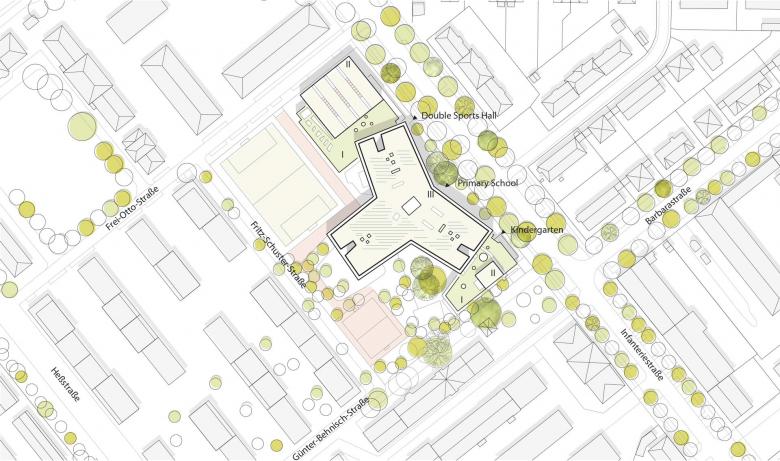 In order to protect as many parts of the building as possible from the noise of the Schwere-Reiter Strasse, the individual building structures form a differentiated spatial streetwall to the Infanteriestrasse in the northeast of the site. In the north, the sports hall marks the starting point of the ensemble, followed by the three-storey primary school building, slightly set back, and the one-storey house for children as the border in the south. Each of the buildings can be accessed separately. The forecourt that is created can also be used by the residents of the neighbourhood outside of school hours. The school courtyard is designed as a multi-coded learning environment. On the south side of St. Barbara church, new, special outdoor facilities will be created with greenery, play areas and public footpaths, which will become part of the green strip in the creative district, linking existing elements and the newly planned areas of leisure and experience. They will create a transparency between the school and the heterogeneous surroundings of small buildings. In this way, the school life will be carried both into the school building and out of it, as a flowing space of communication for all visitors to the building.