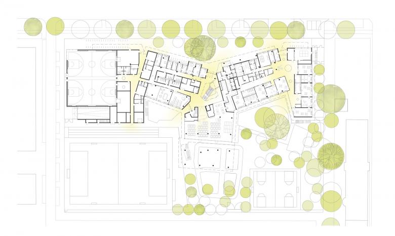 The two star-shaped upper storeys, set above one another, contain a total of five learning houses, as well as a smaller learning house for the subject-based classes on the first floor. The roofscapes on the first floor are embedded in dense roof greenery and provide space for the school garden, smaller events, seating and further utilizations such as the caretaker’s house in the form of a roof pavilion on the house for children.
