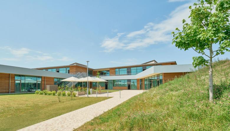 The subject-specific classrooms are situated in their own building wings which are level with the entrance and protrude into the landscape like “green fingers”. The two-court gymnasium is situated in the western part of the site along the Kreuter Weg and, as one wing of the building, has been partially dug into the ground. Above it are outdoor sports areas. All circulation areas can also be used as part of the daily educational work.
