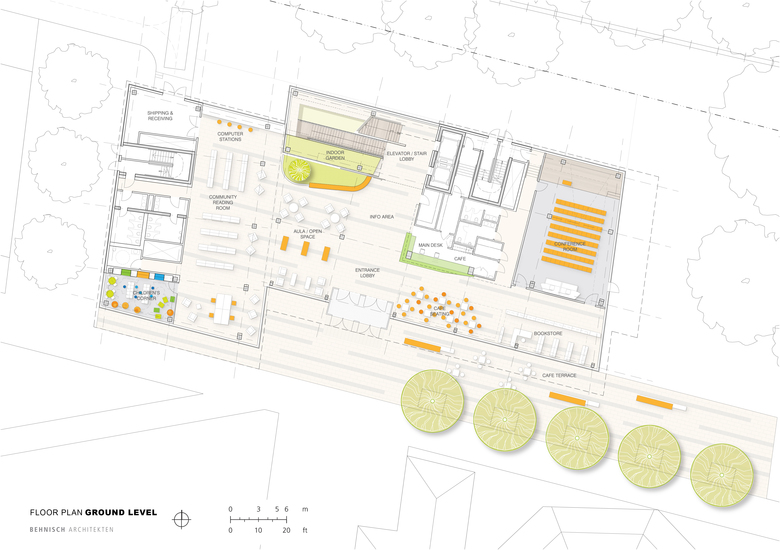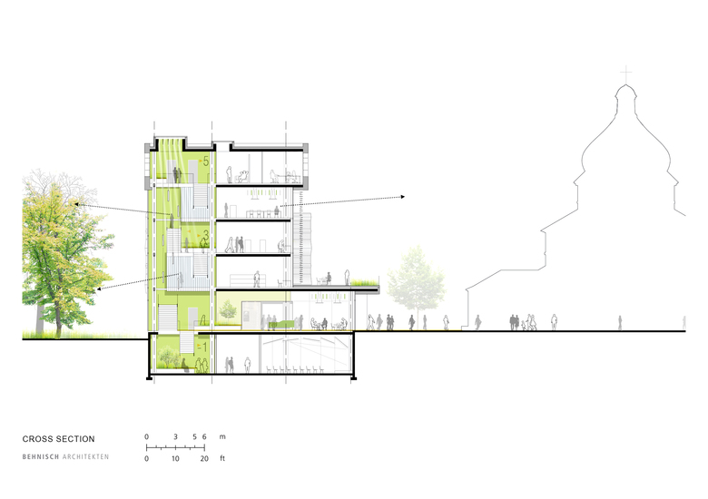 From an architectural point of view, the term openness plays a major role in the design of the building. This concept is reflected in the barrier-free ground floor of the building. The reading, exhibition and conference areas as well as a café and the university bookshop are located here. The upper levels of the building are more academic in nature, with a predominantly open-stack collection, various reading spaces, quiet study zones and group work rooms. Both the public and academic portions of the building are flexible spaces organized around a vertical atrium space that always affords views out to the beautiful Stryiskyi Park located adjacent to the campus.